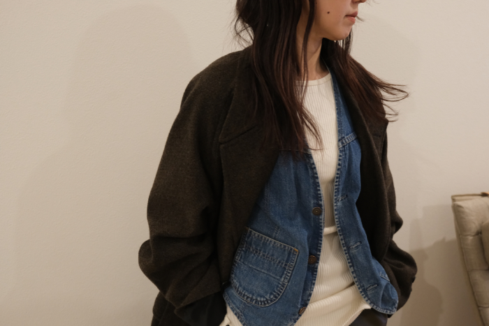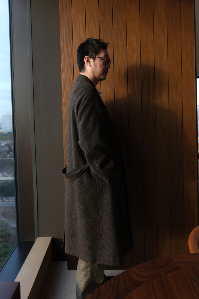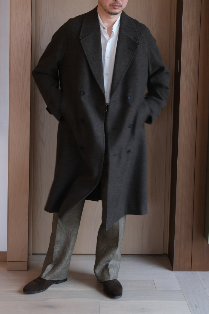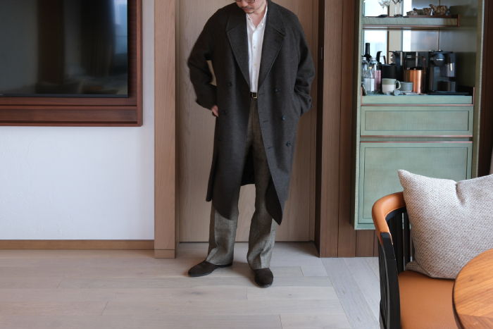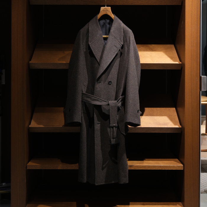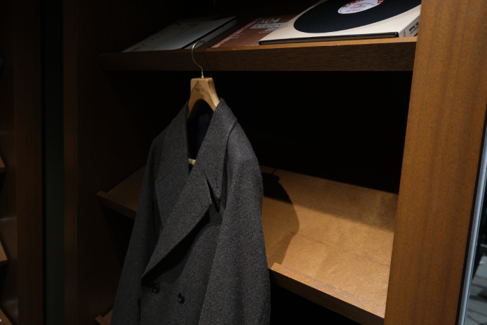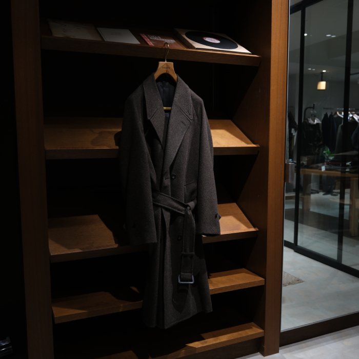 当店のサロンカテゴリーに属するドレス、クラシック、アルチザンなどのアイテムとの相性は良いだろうと、ただカジュアルセクションのアイテムとの親和性はどうだろう?と言うのが正直な気持ちだったが、アトリエのラックにハンギングで掛かったコートを見て、また実際に袖を通して、無用な心配だったと瞬時に悟ることになりました