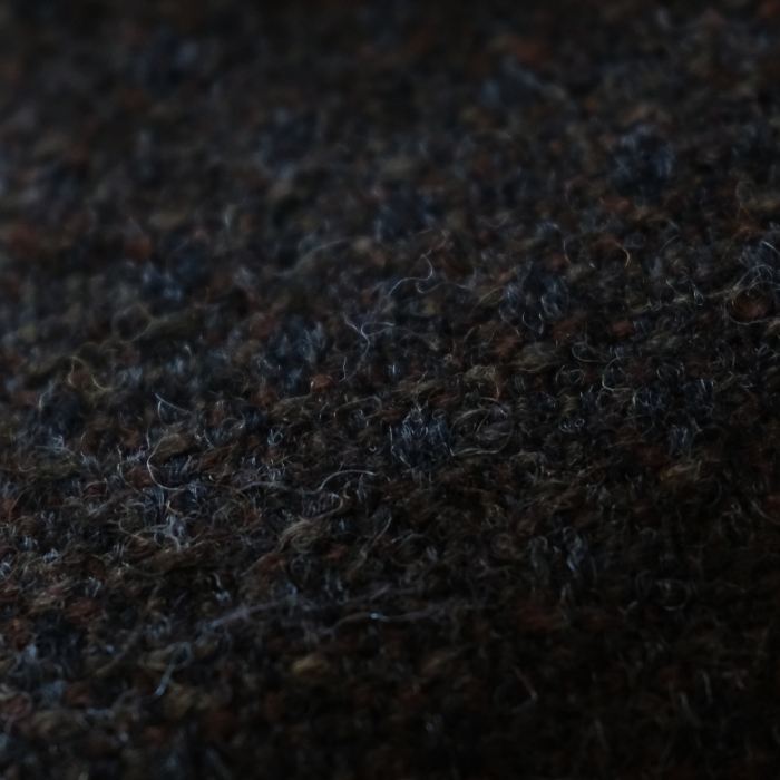 上記の通り7色の色を用いて複雑な色合わせをダークブラウンベースに落とし込んでいるが、遠目には柄が目立たないように表面に少しの毛羽で留めておくことで、光の当たり方によって隠れていたダイヤ柄が奥から浮かび上がってくる、そこに7色の色がチラチラと輝いて見える