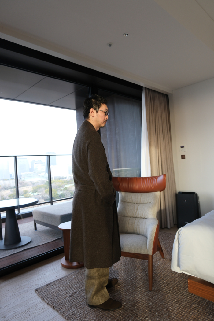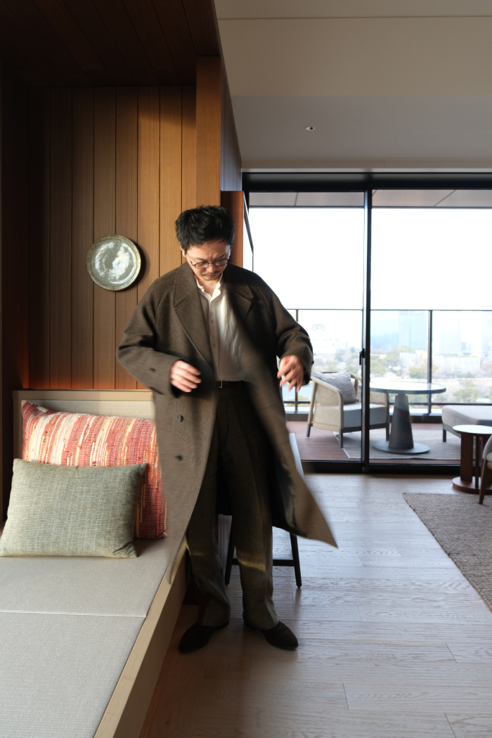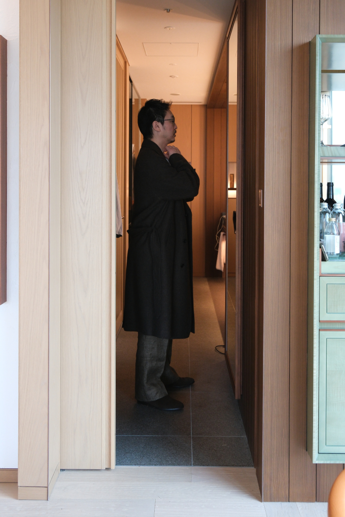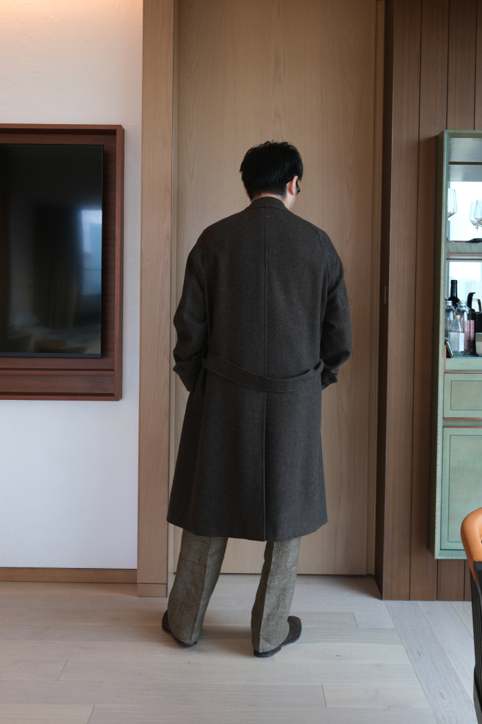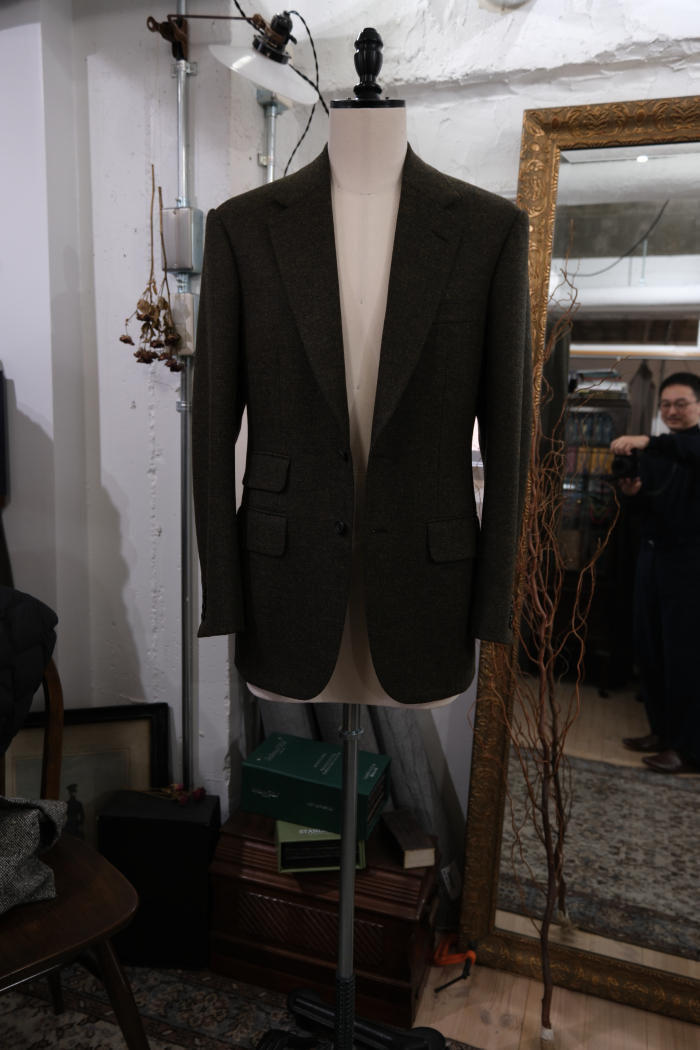 自惚れ感ダダ漏れではあるが姿見に映る袖を通した自身の姿は、先入観にあったイギリス的な構築的ショルダーラインに象徴されるコンケープされた肩山ではなく、ナチュラルに袖口へと伸びる美しい曲線とフロントの前端(打合い部分)と身頃のアウトラインが真っ直ぐ直線に伸びるスマートなラインがなんとも印象深く、感動の声を何度も出してしまうほどだった