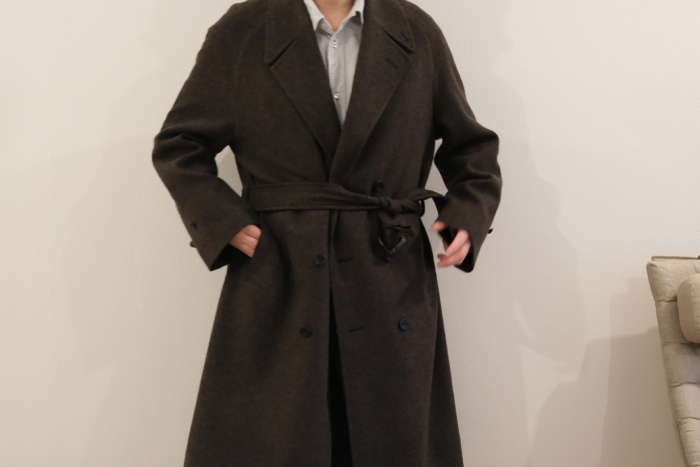 着用画像のコートは、ダブル合わせ、にも関わらず前端の位置は、まるでシングルコートのような場所に収まっている