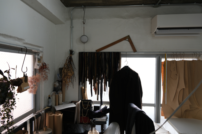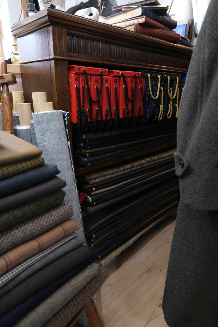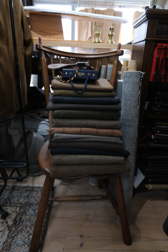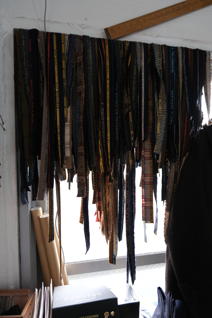 窓際に整然と重ね掛けられた生地耳は、これまで手掛けてきたビスポークアイテムに使用してきた生地の端切れ